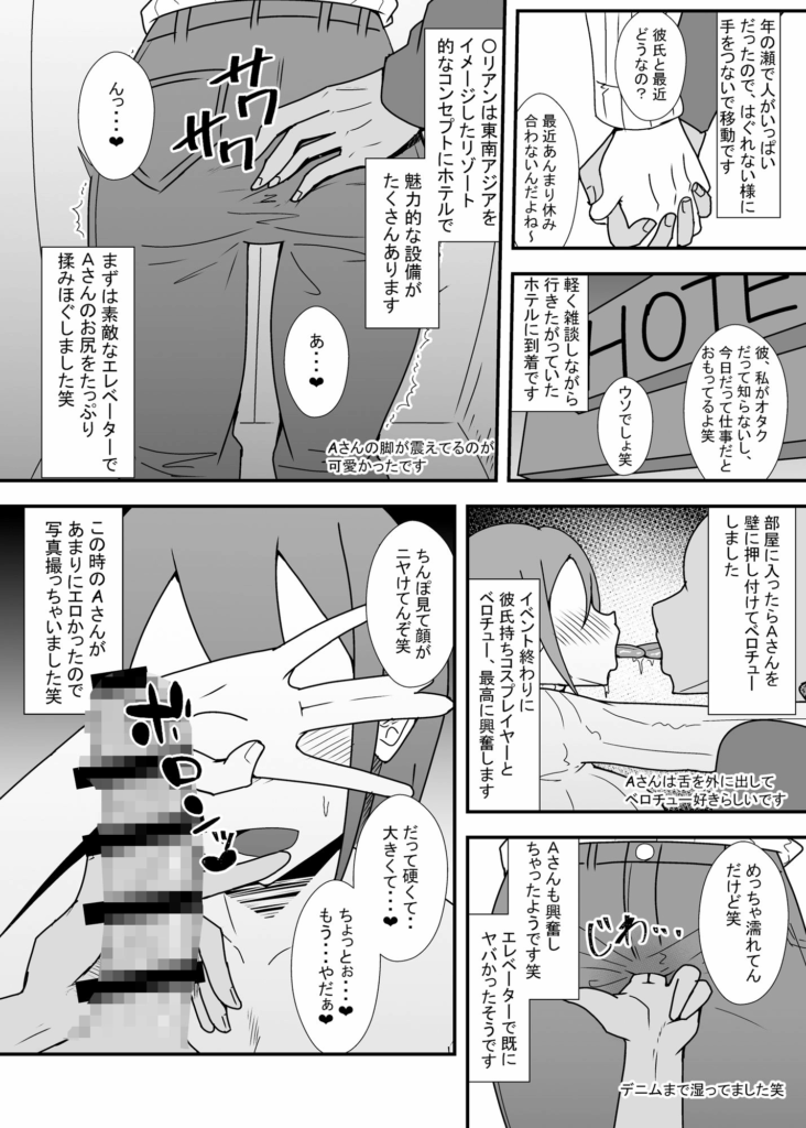 自粛ムードも過ぎ去り久しぶりのイベントです。イベントといえばやっぱりアフター。彼氏持ちのコスプレイヤーのAさんは遠征組で、地元にはおしゃれなラブホがないとか・・・。ということで今回はコスプレイヤーのAさんとバリ●ンに行ってみました。前日にコス売り子をしていたAさんの写真を見ながらフェラをさせるの最高でした笑